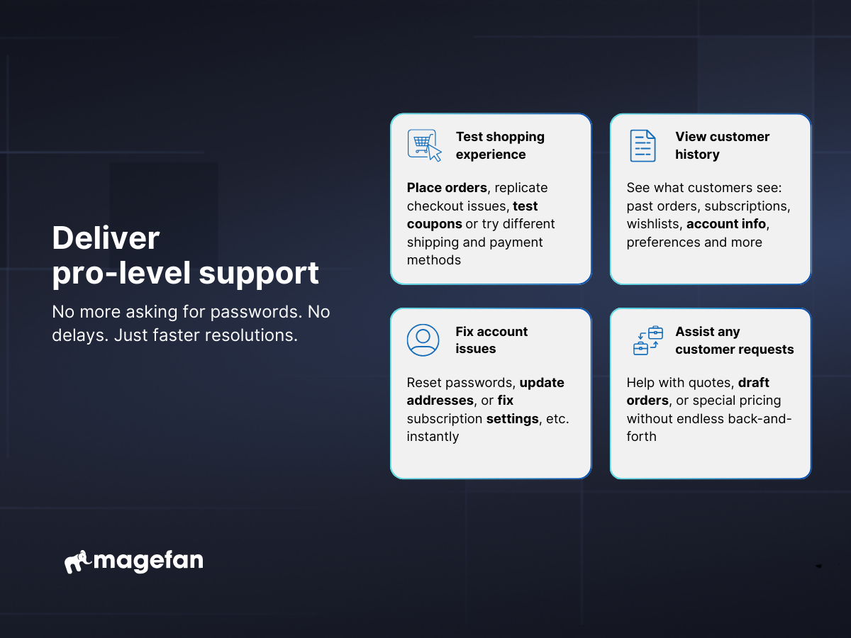 Optimise your customer support and deliver better and faster service with little effort. Log in as a customer directly from the admin panel and assist customers with various tasks. Place orders, prepare shopping carts, fill out order details, finish account set-up, fix account-related issues and more. No password or authentication data required. Just one click, and your sales and support managers are already there. Help customers all the way through their journey, fix issues faster and deliver an exceptional experience at zero effort.